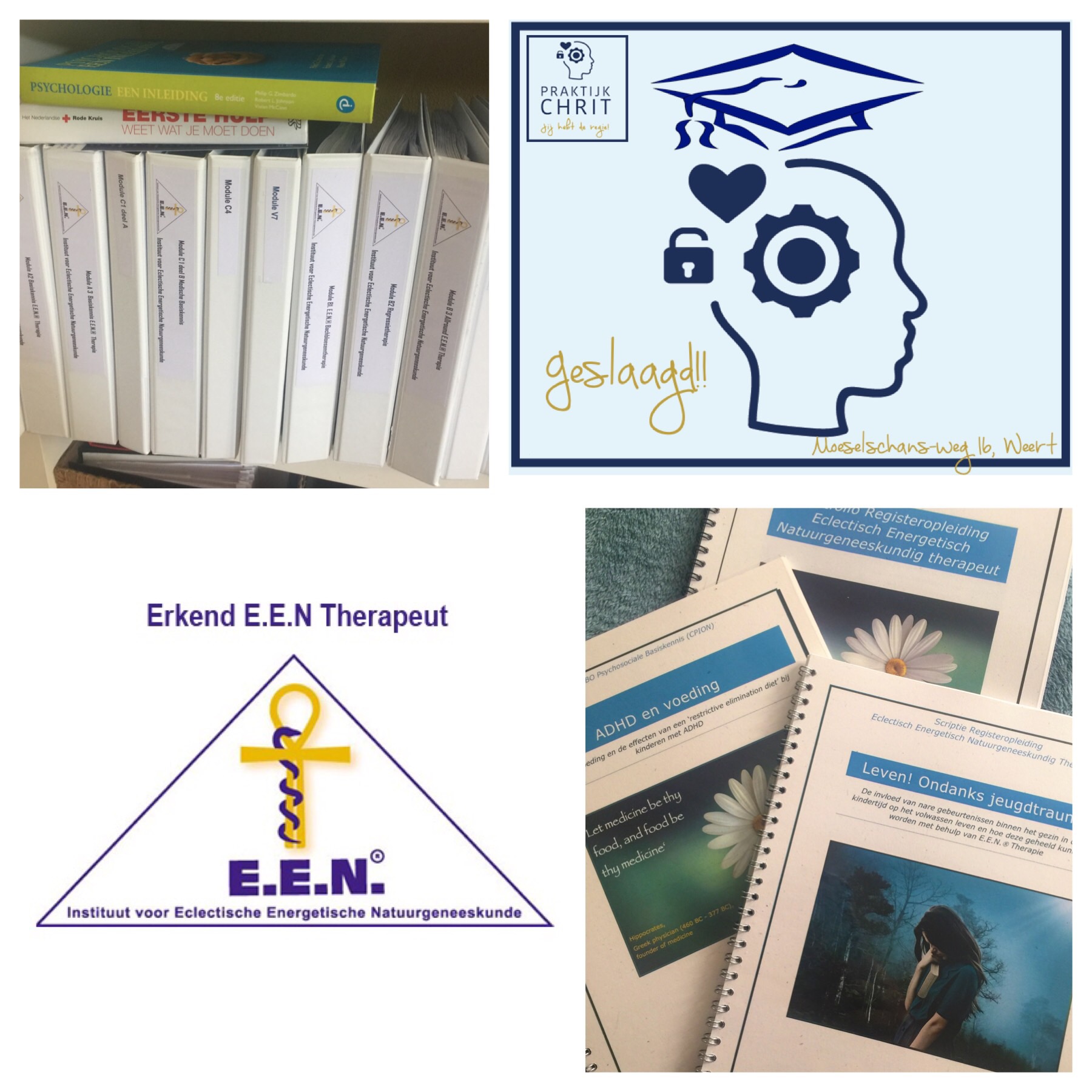 Na 3 hele intensieve jaren met 7 modules E.E.N.®-therapie, de modules HBO MBK Anatomie en MBK Pathologie, HBO Psychosociale Basiskennis en Psychpathologie, uitgebreide EHBO en 14 examens, een stapel huiswerkopdrachten, een thesis ‘ADHD en voeding’, een scriptie over ‘leven, ondanks jeugdtrauma’ , een stage én een héleboel (proef)cliënten verder, ben ik KLAAR!