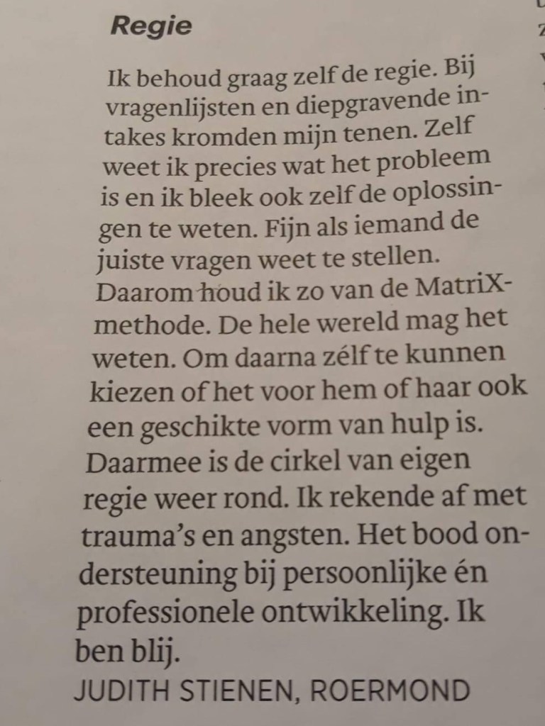Tijdens het traject zelf had ik constant het gevoel dat ik serieus werd genomen en in mijn waarde werd gelaten en dat ik mijzelf kon en mocht zijn. Wat ik heel goed van jou vond was dat je soms ook goed “door me heen prikte”, als ik probeerde heftige thema’s te omzeilen. Daarbij hield je wel rekening met wat ik op dat moment aankon. De MatriXmethode werkte voor mij goed.