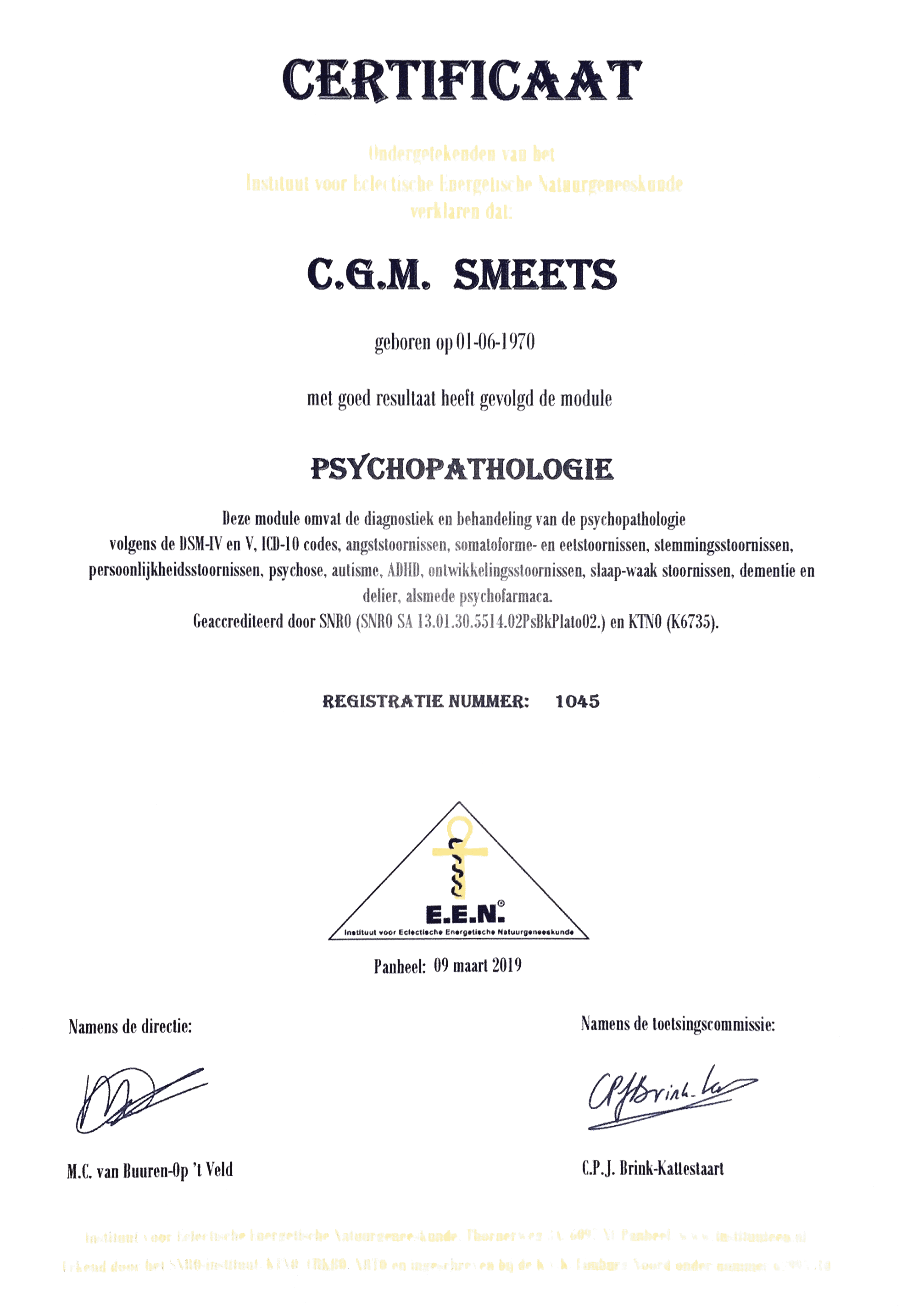 Nog 1 te gaan! Bijna 3 jaar geleden gestart en 13 examens later ontving ik gisterenavond mijn 13e certificaat van de opleiding tot register Eclectisch Energetisch Natuurgeneeskundig therapeut, ofwel E.E.N.®-therapeut. Het onderdeel HBO Psychopathologie heb ik afgesloten met een 9 voor mijn thesis “Voeding en ADHD” en een 9,5 voor het examen. Een mooie aanvulling ook op de MatriXmethode. Een verdieping die mij nog meer inzichten biedt bij het helpen van kinderen en volwassenen met angsten, trauma’s, het verwerken van emoties en volle drukke hoofden.